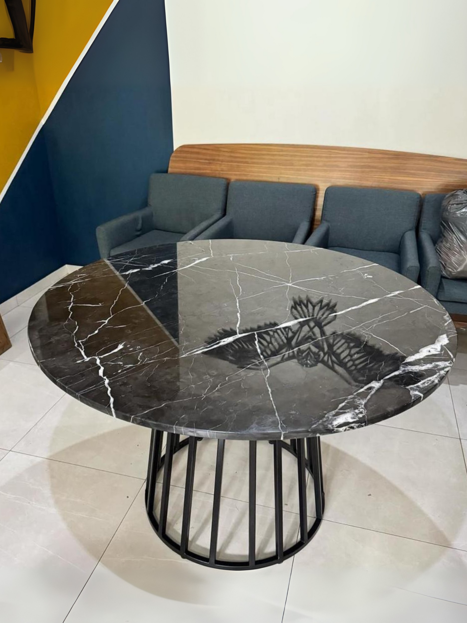 • Material: Cuenta con una cubierta de mármol Negro marquina, con una base de estructura metálica, Cabilla de 1/2 pulgada color negro mate u otro