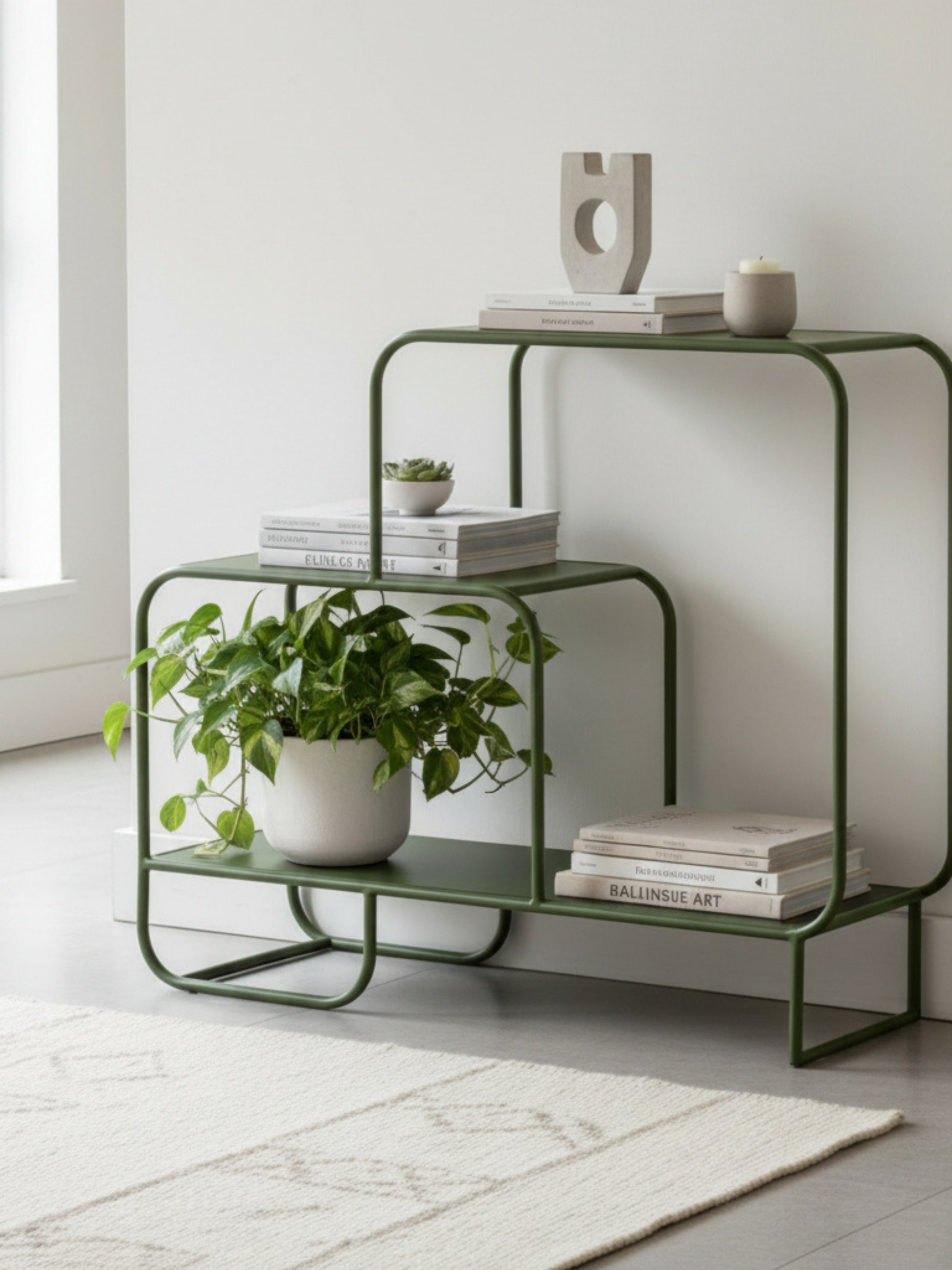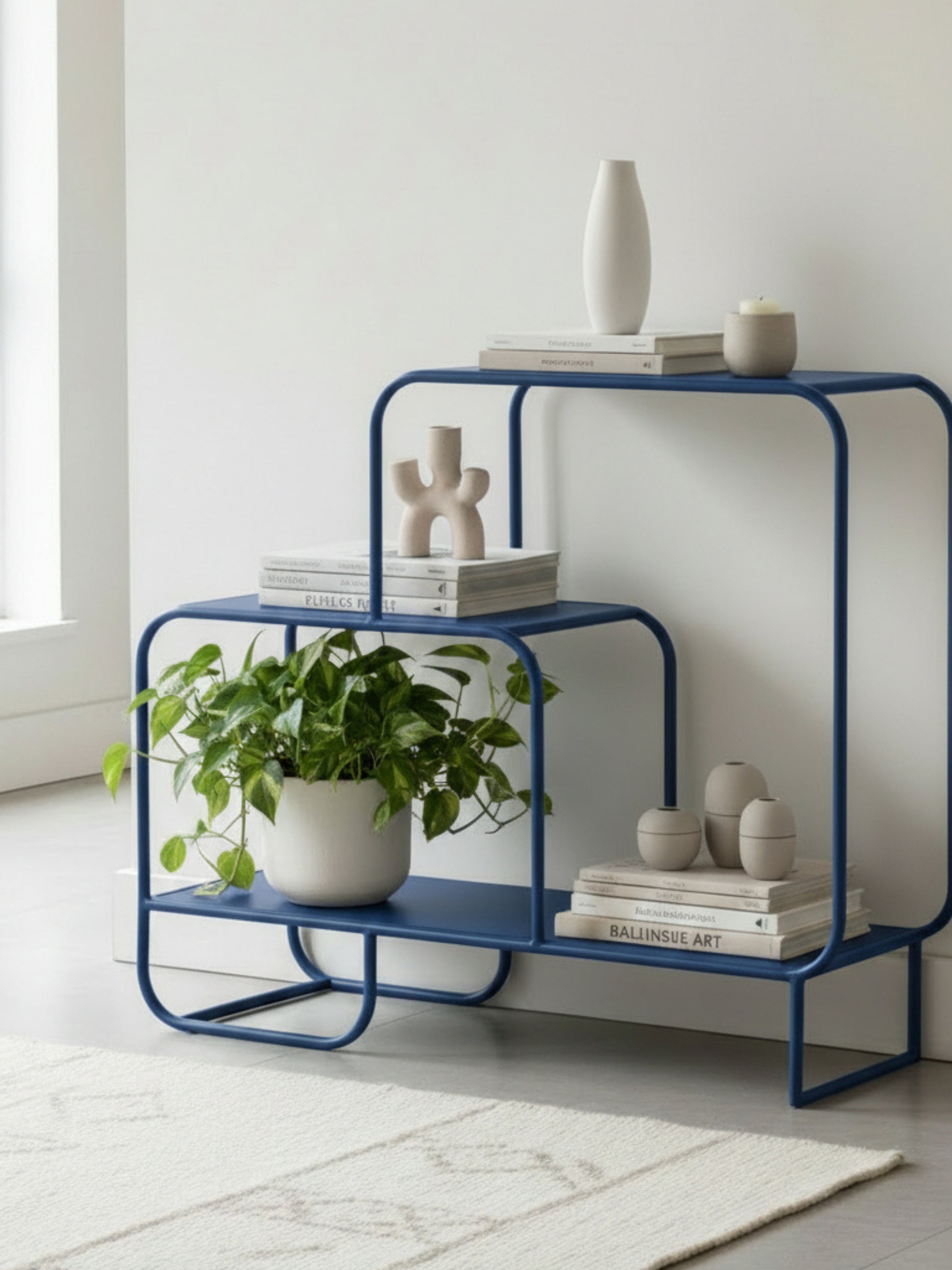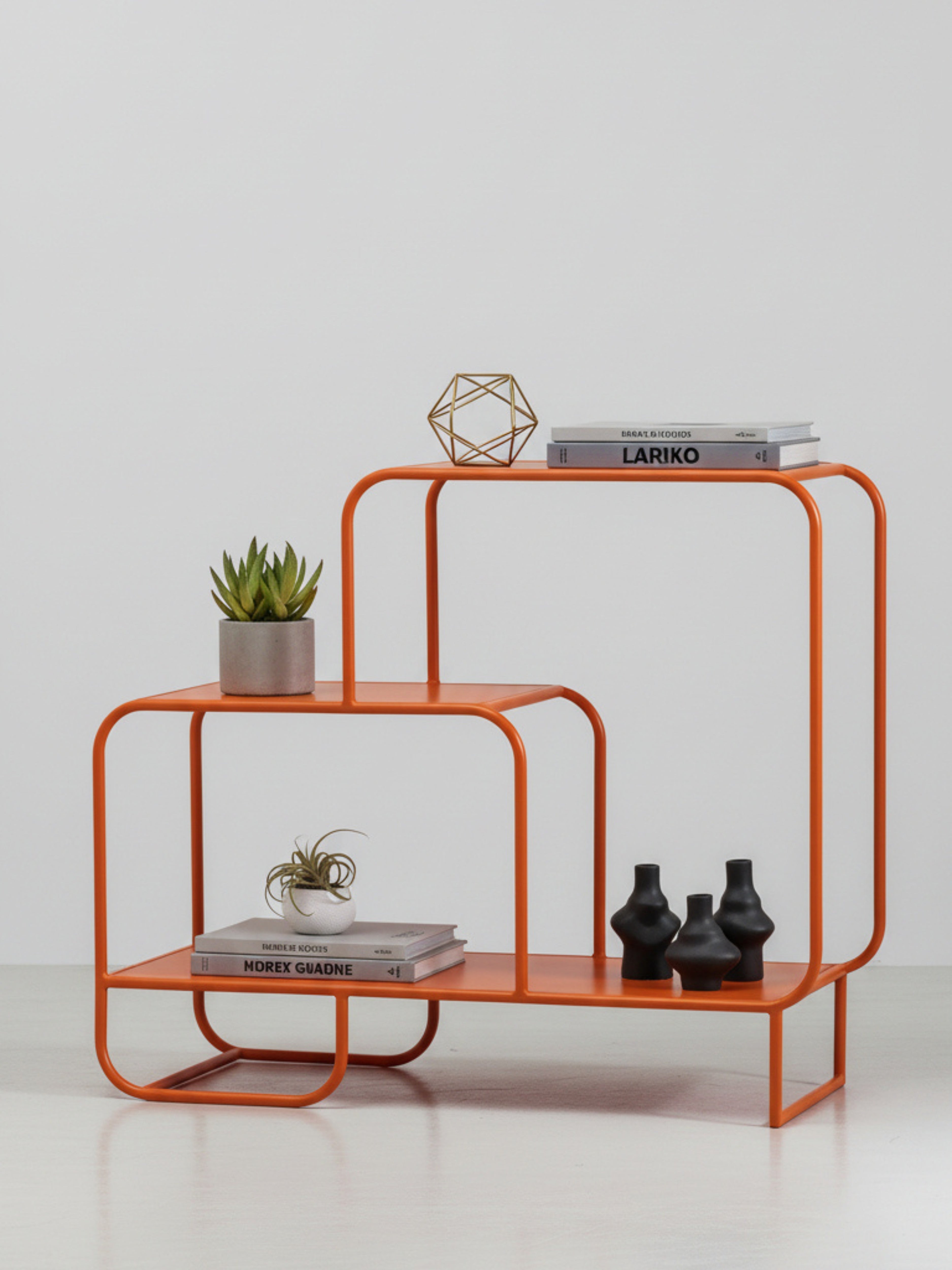 Credenza con diseño moderno y versátil pensada para darle estilo a tu entrada, sala o cualquier espacio de tu hogar. Su estructura metálica con acabado negro semi mate garantiza resistencia y un look minimalista. El diseño escalonado con tres repisas de diferentes anchos crea un efecto asimétrico que aporta dinamismo a la decoración.