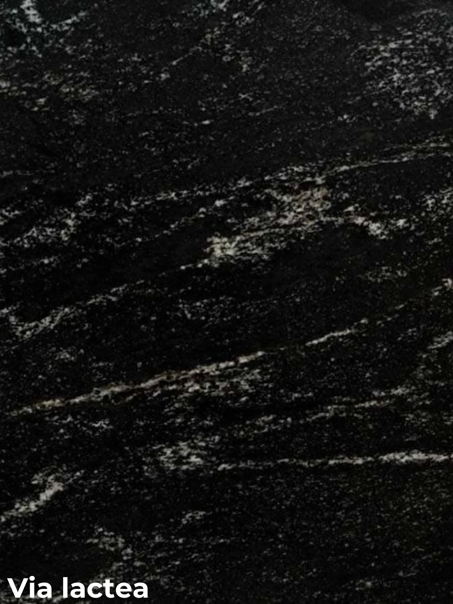 Granito Negro Vía Láctea, con vetas blancas que recuerdan la inmensidad del cosmos.