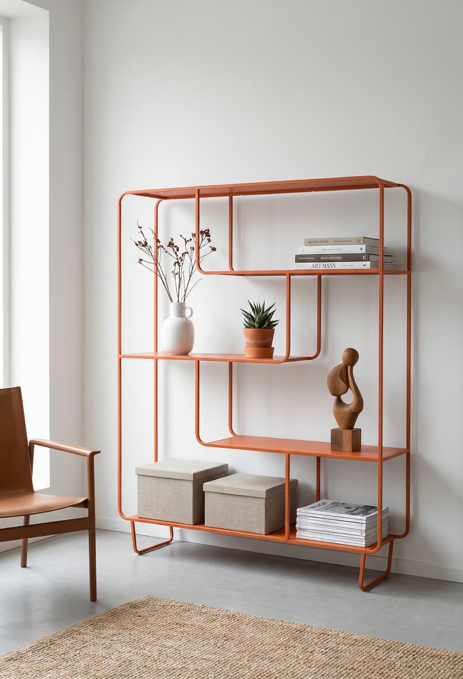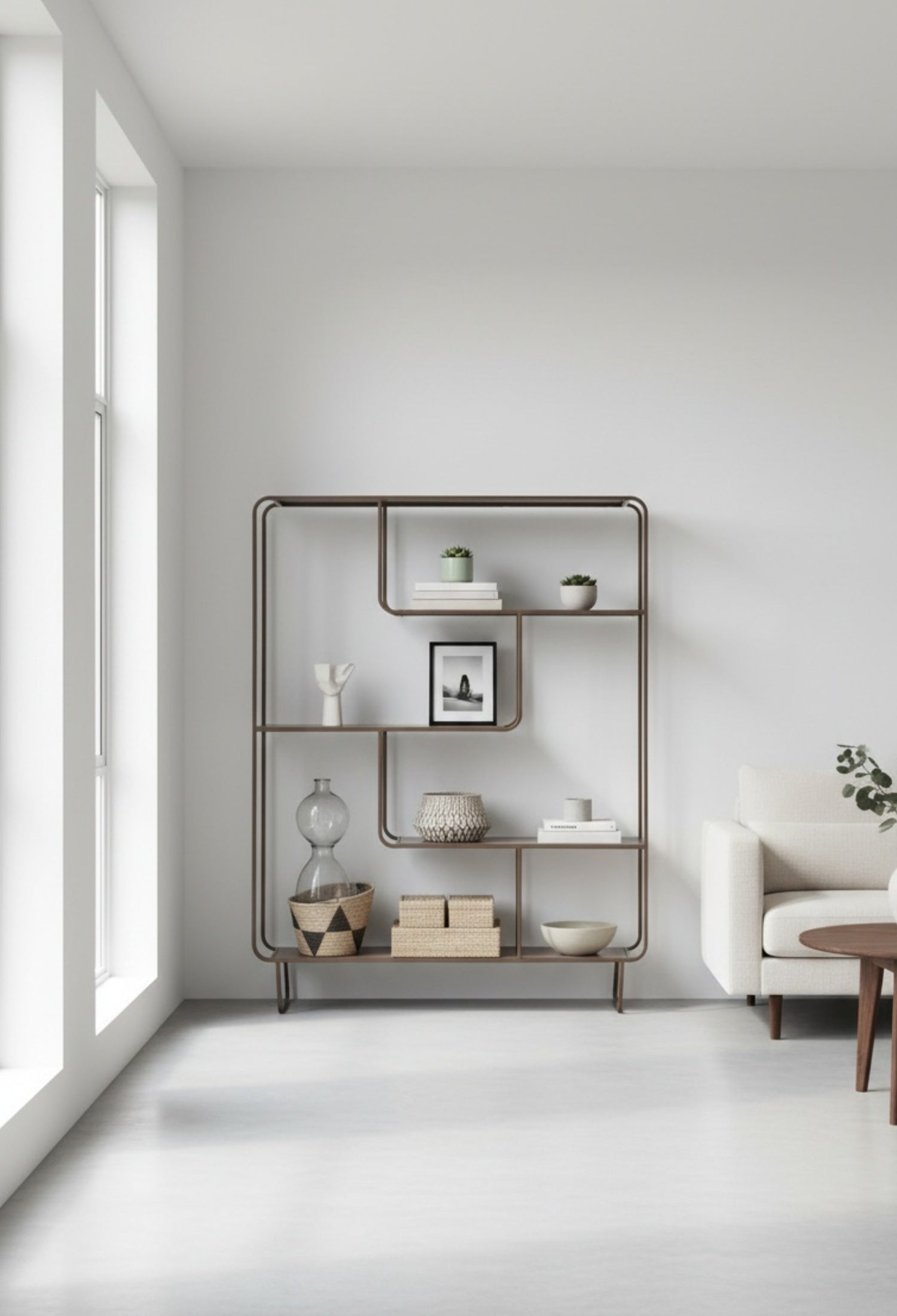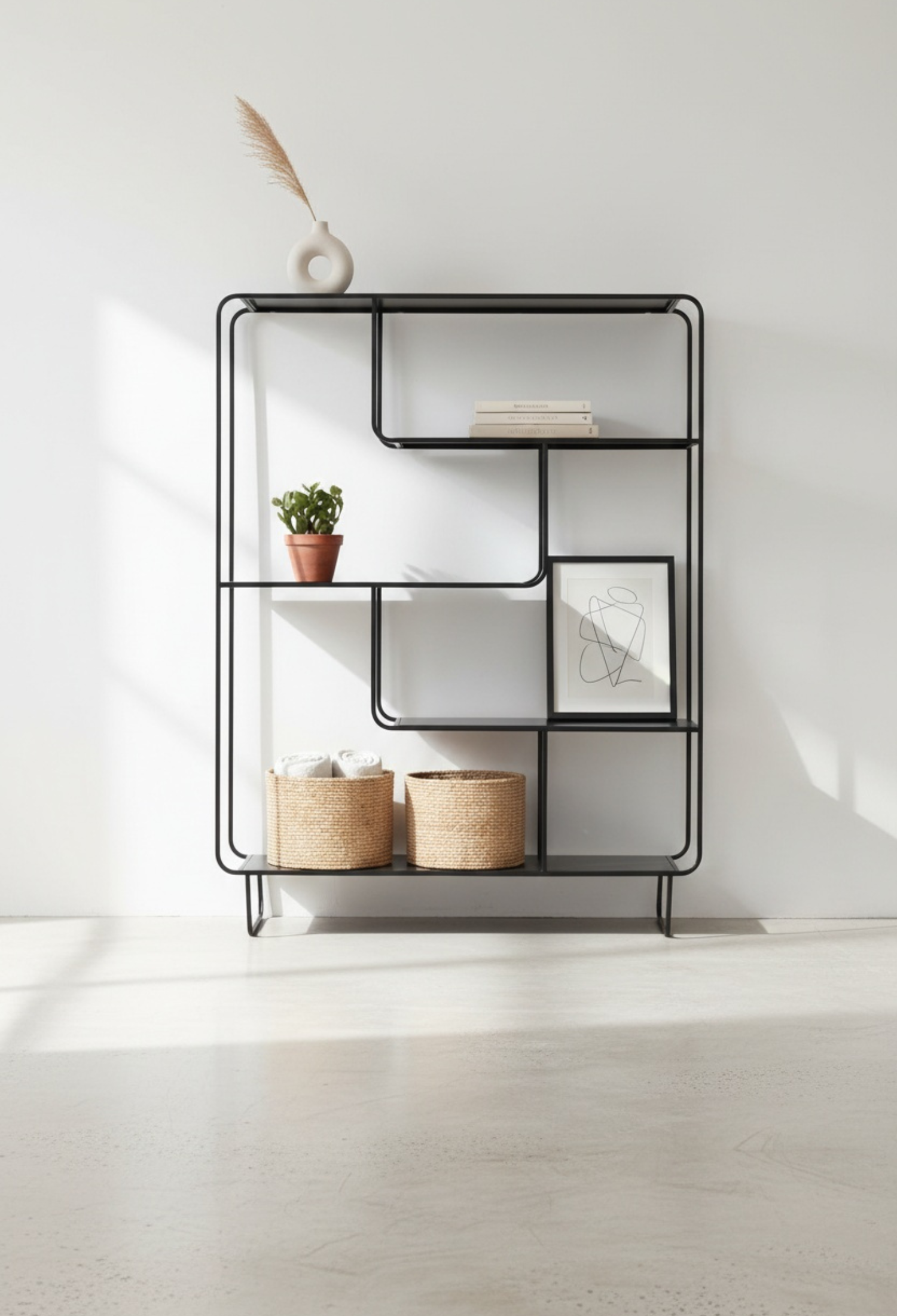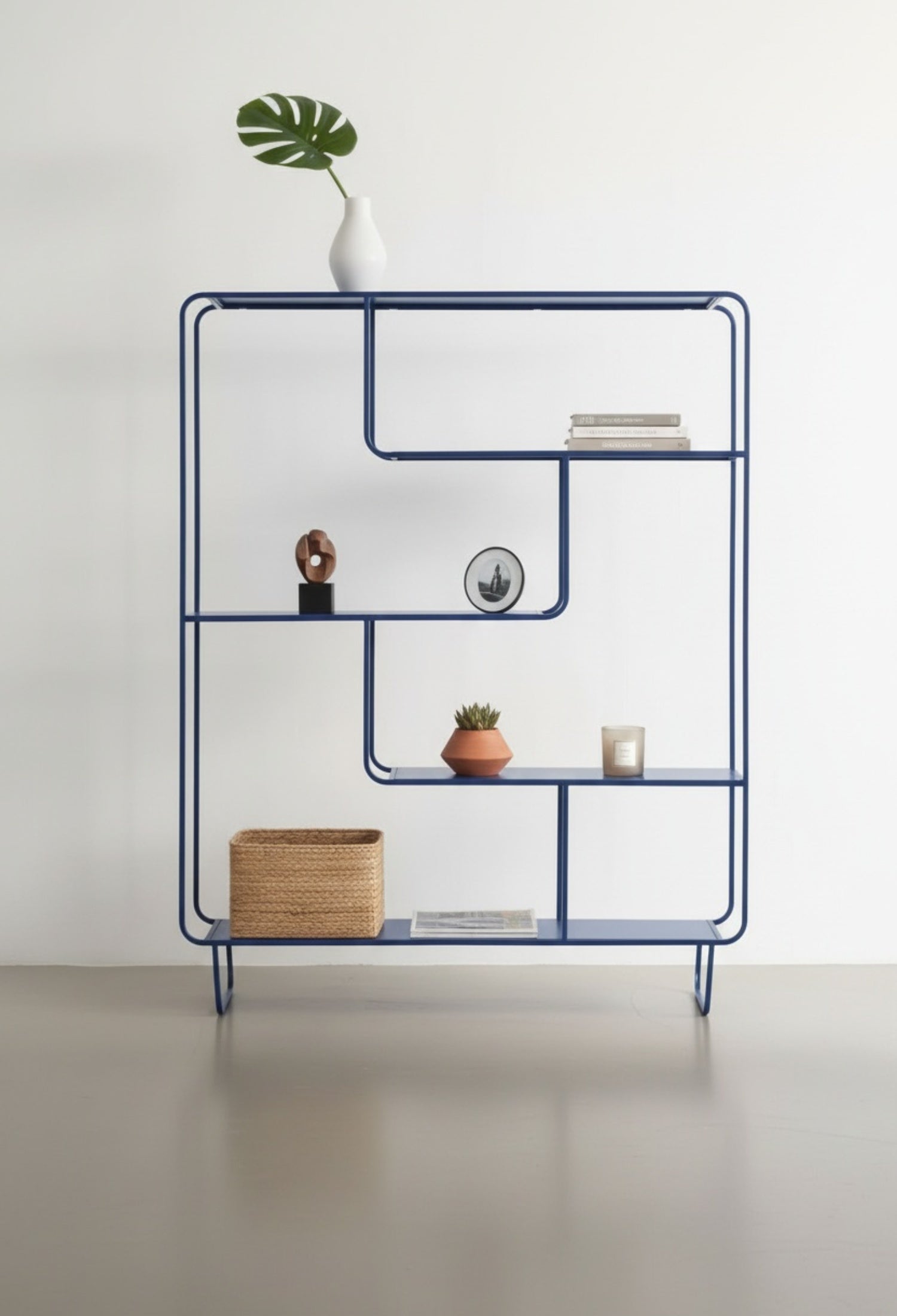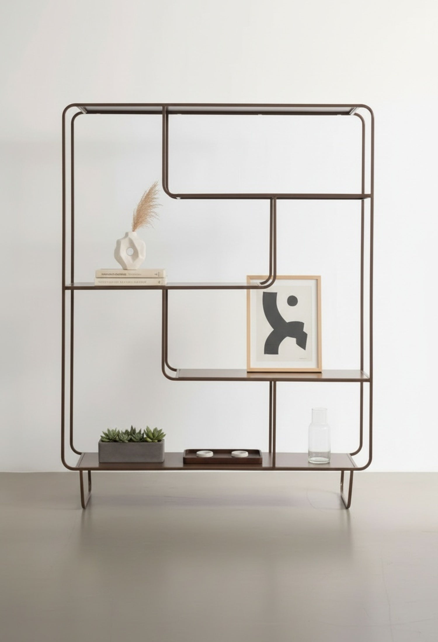 Estante Segovia con diseño geométrico y líneas continuas que aportan ligereza visual y un estilo moderno. Su estructura abierta de acero permite exhibir libros, objetos decorativos y piezas escultóricas de forma equilibrada, convirtiéndolo en un elemento funcional y decorativo ideal para salas, estudios o comedores contemporáneos.