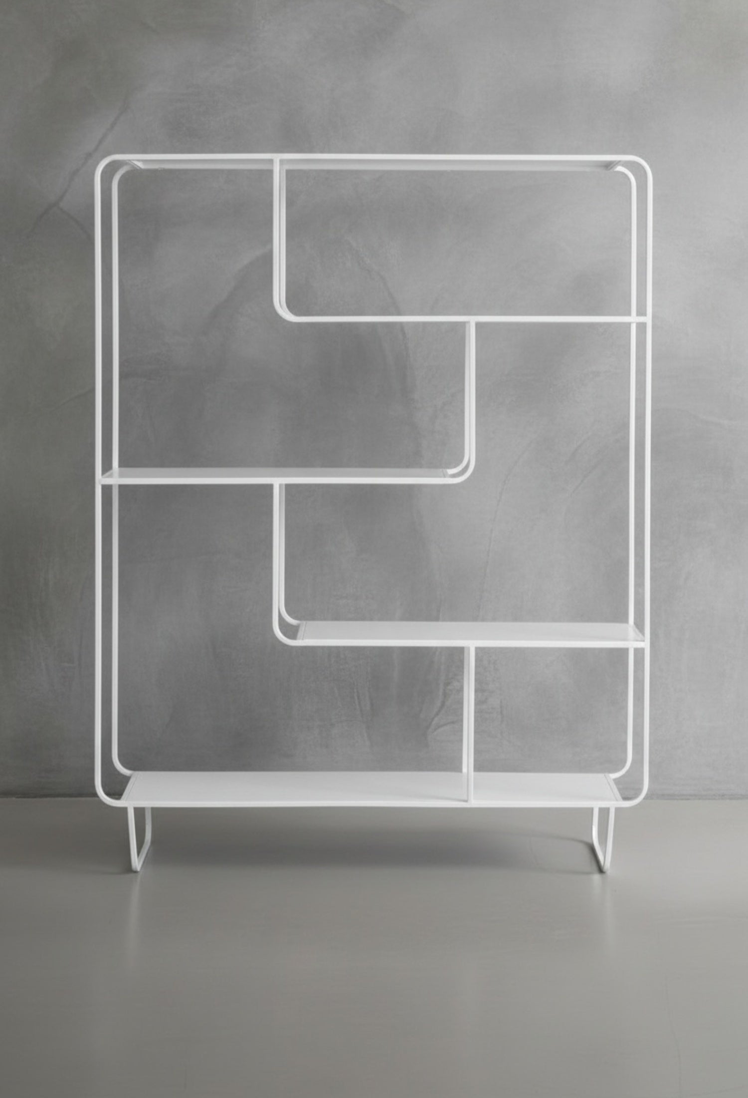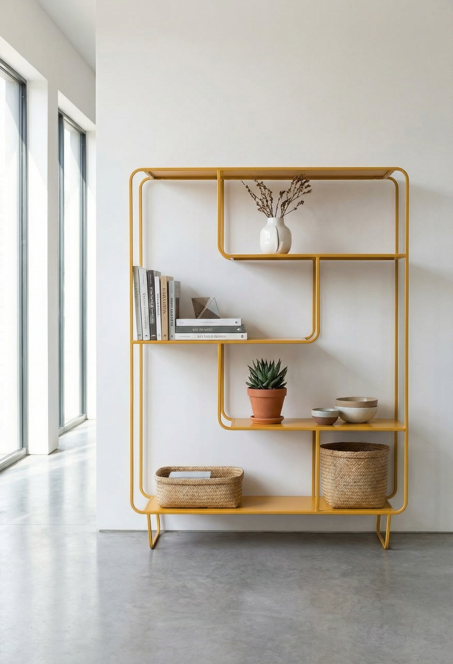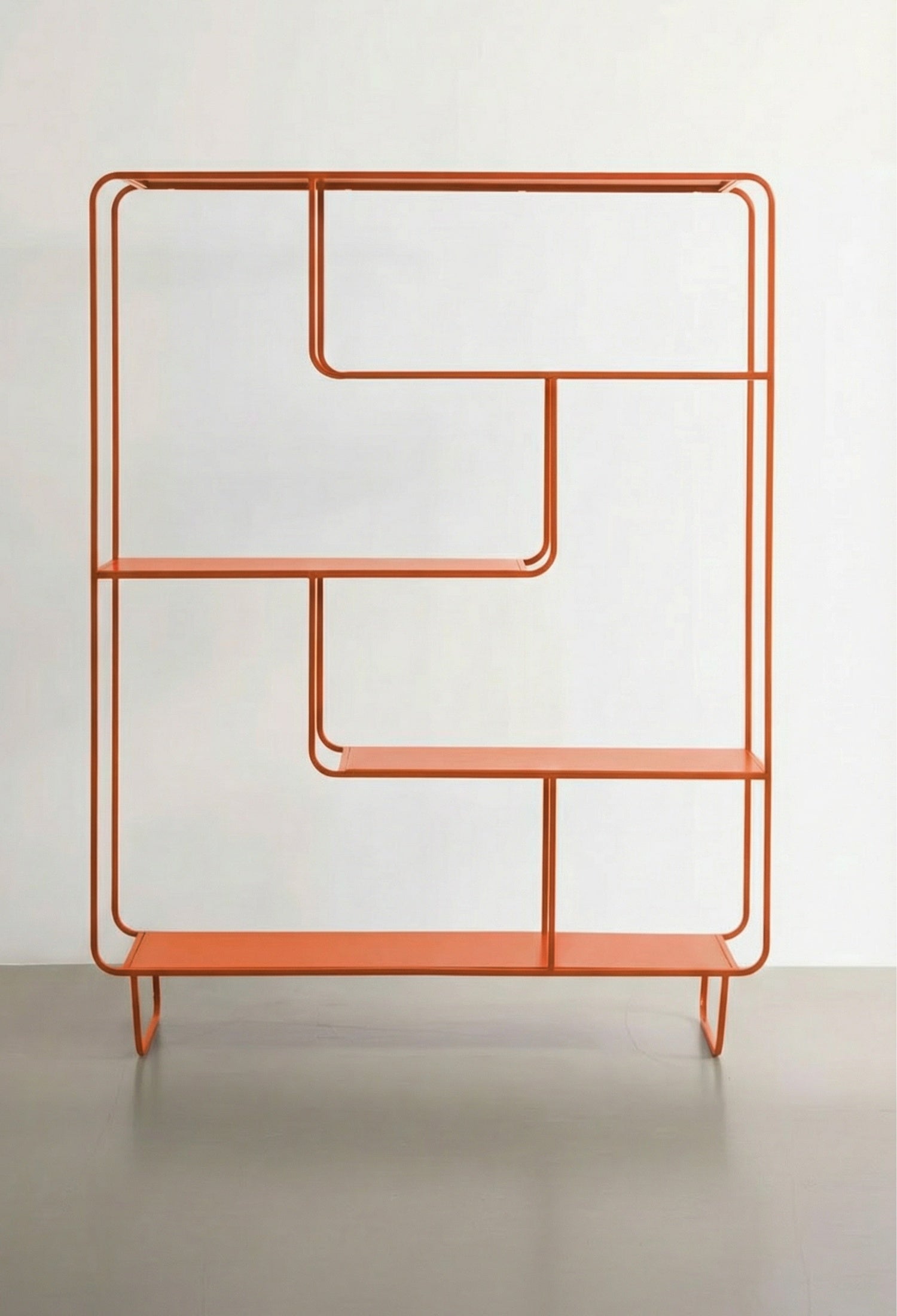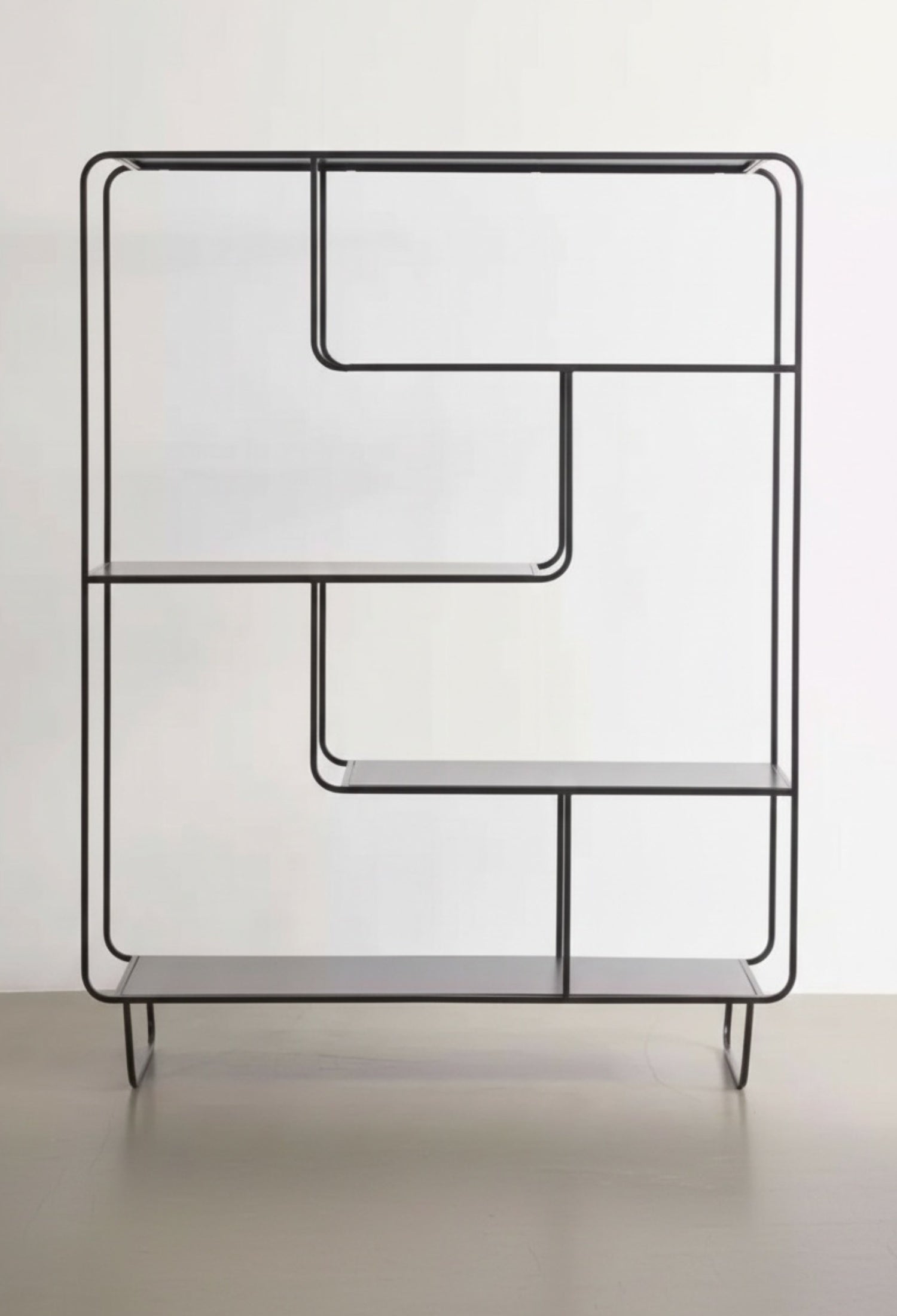 Estante Segovia con diseño geométrico y líneas continuas que aportan ligereza visual y un estilo moderno. Su estructura abierta de acero permite exhibir libros, objetos decorativos y piezas escultóricas de forma equilibrada, convirtiéndolo en un elemento funcional y decorativo ideal para salas, estudios o comedores contemporáneos.