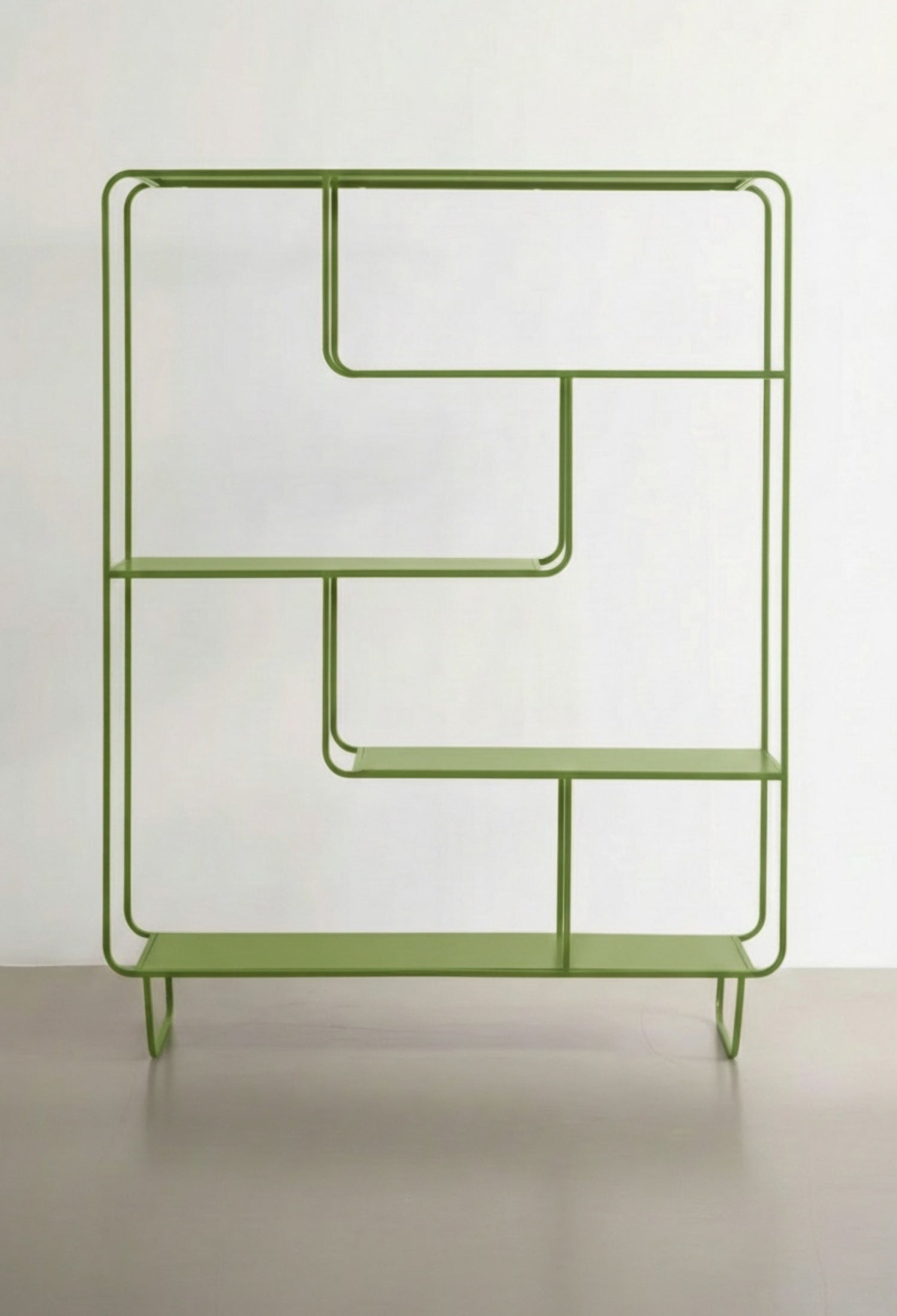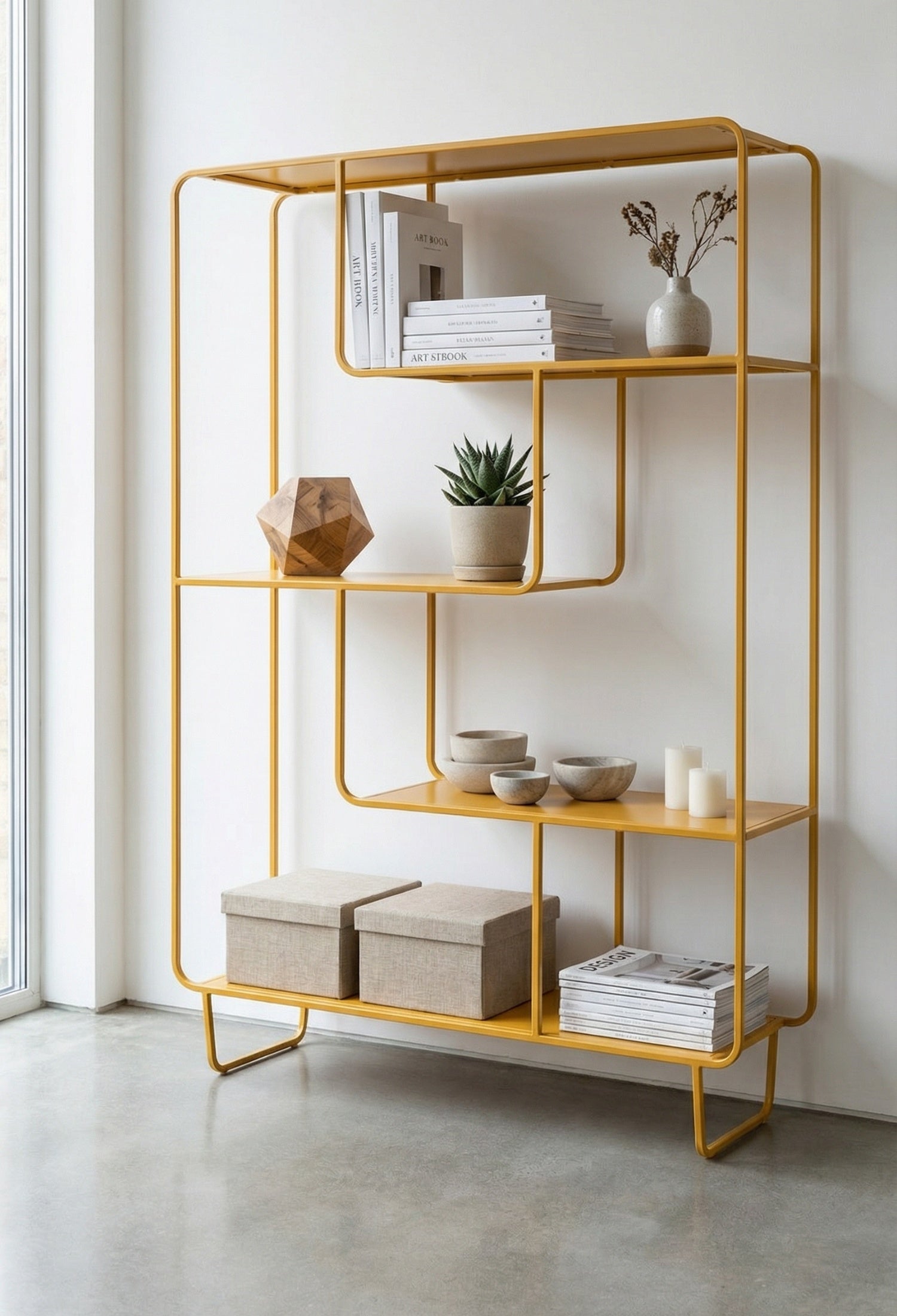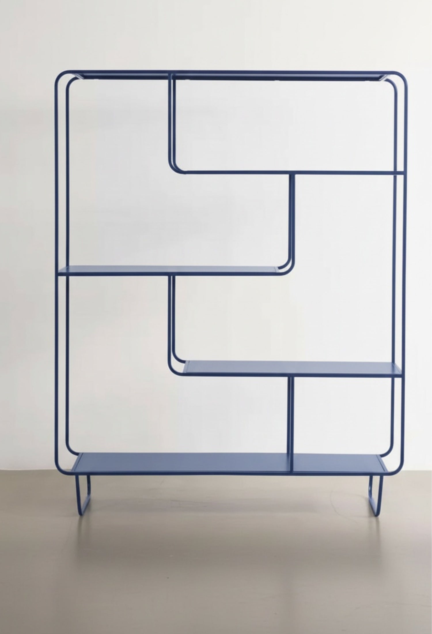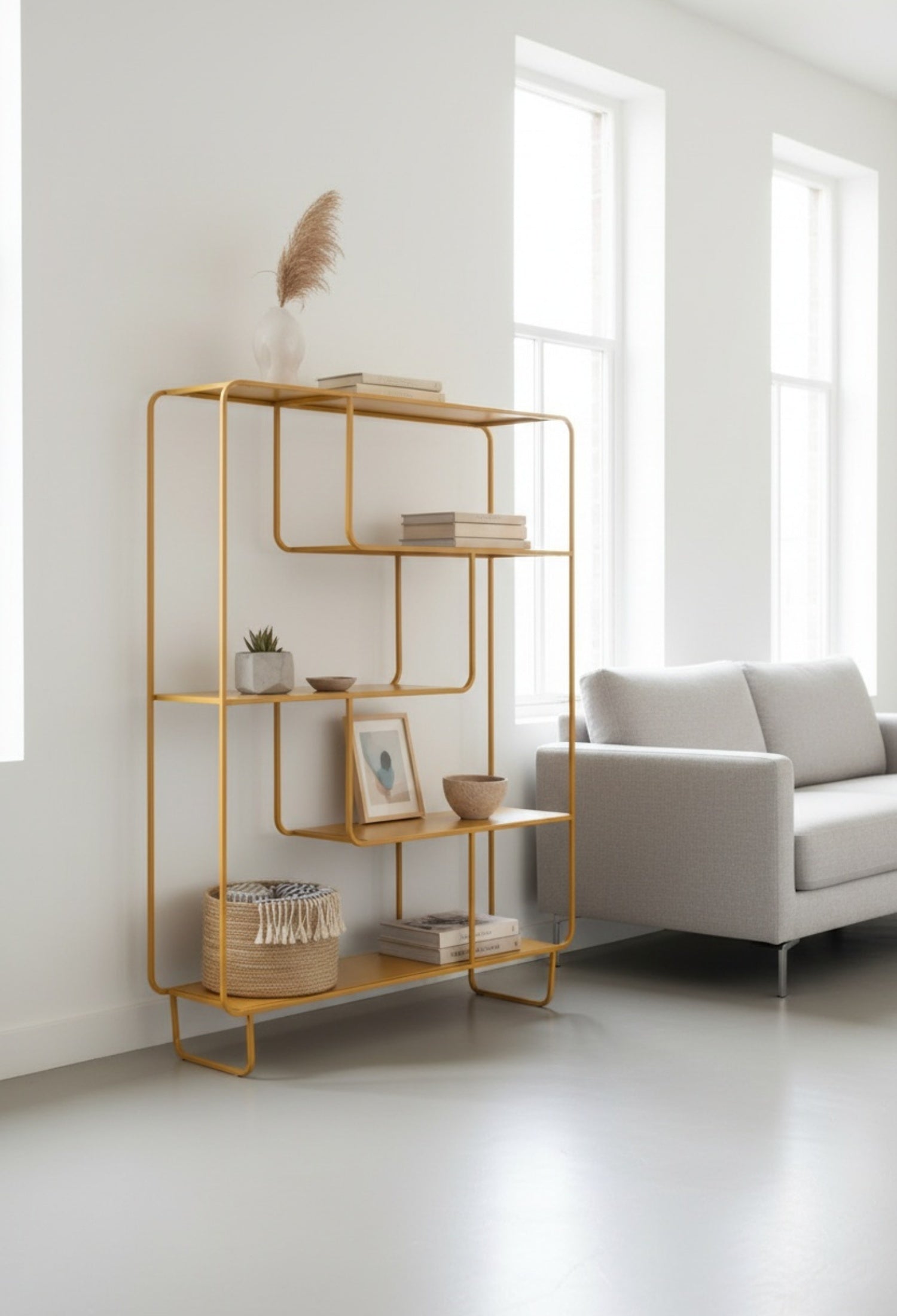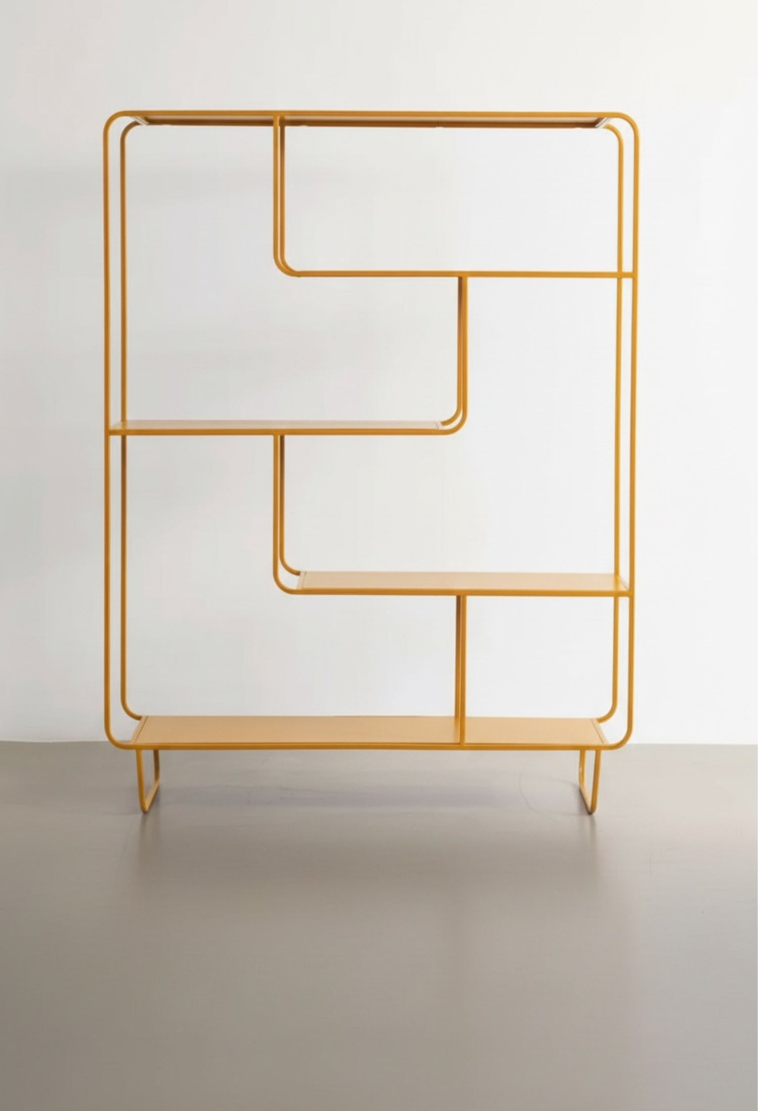Estante Segovia con diseño geométrico y líneas continuas que aportan ligereza visual y un estilo moderno. Su estructura abierta de acero permite exhibir libros, objetos decorativos y piezas escultóricas de forma equilibrada, convirtiéndolo en un elemento funcional y decorativo ideal para salas, estudios o comedores contemporáneos.