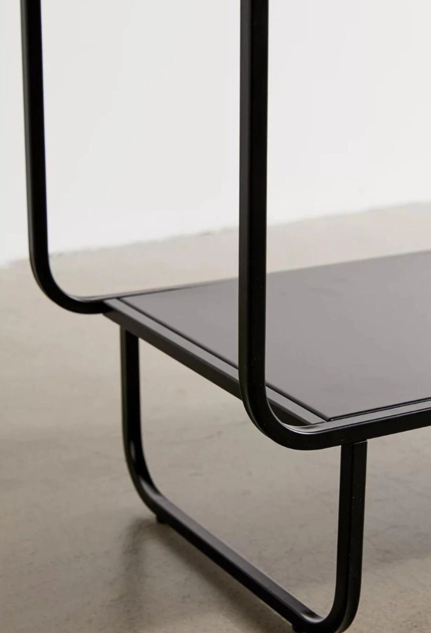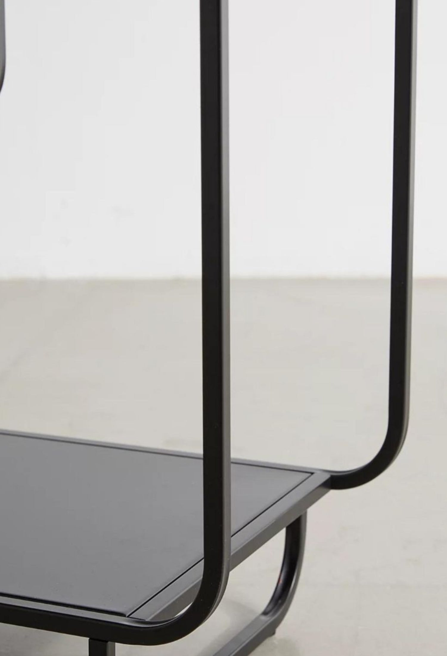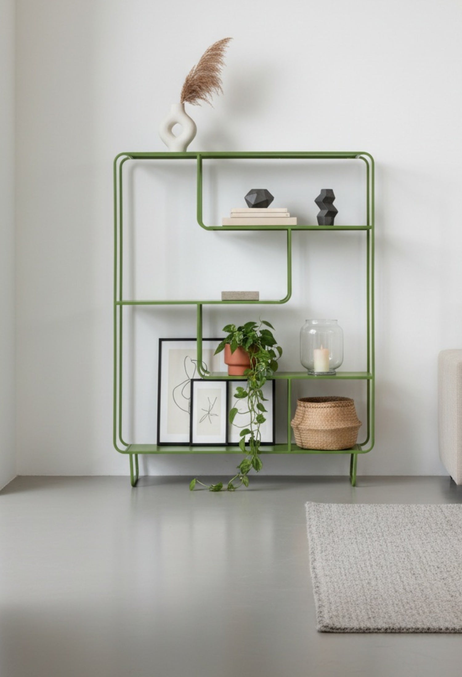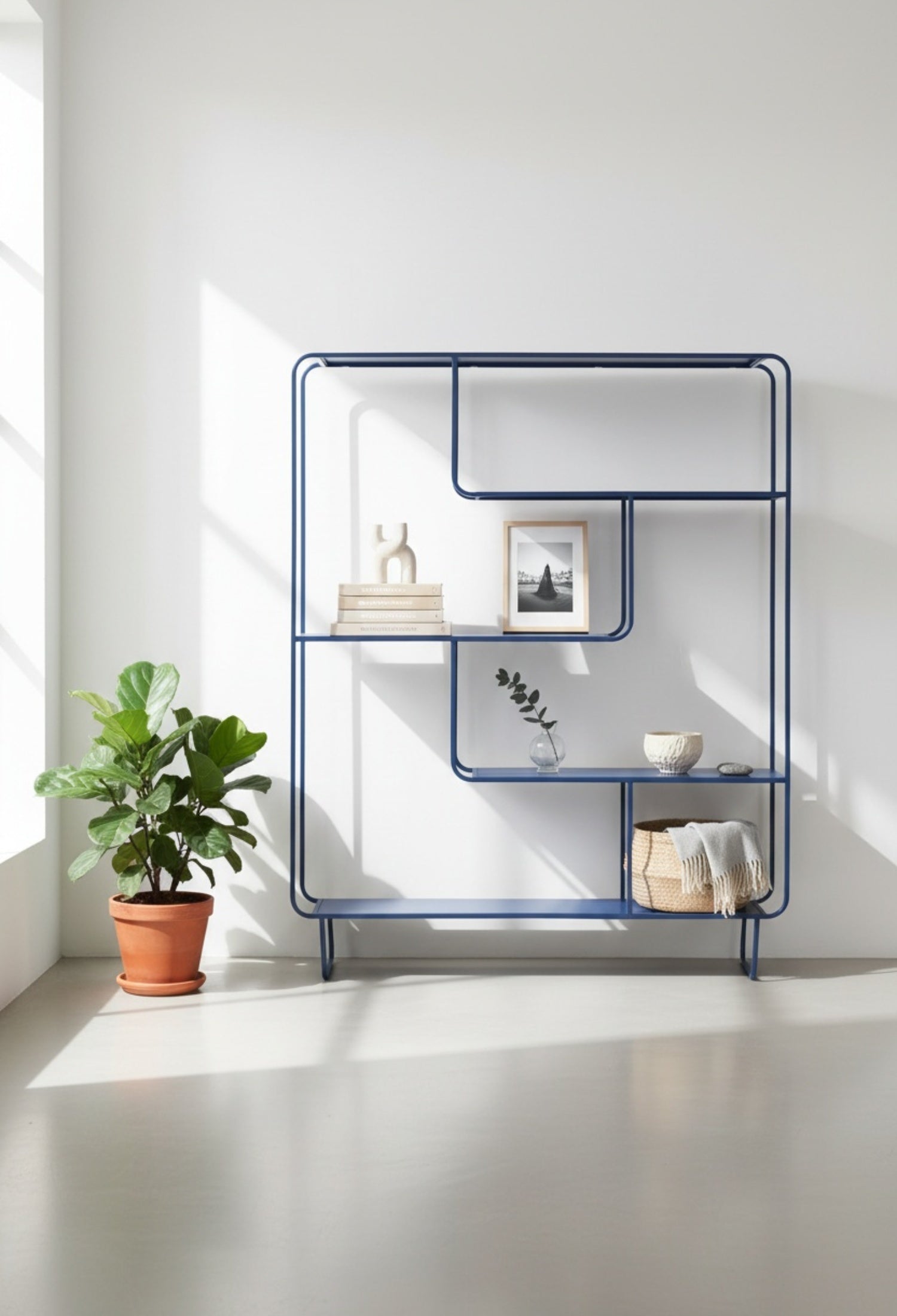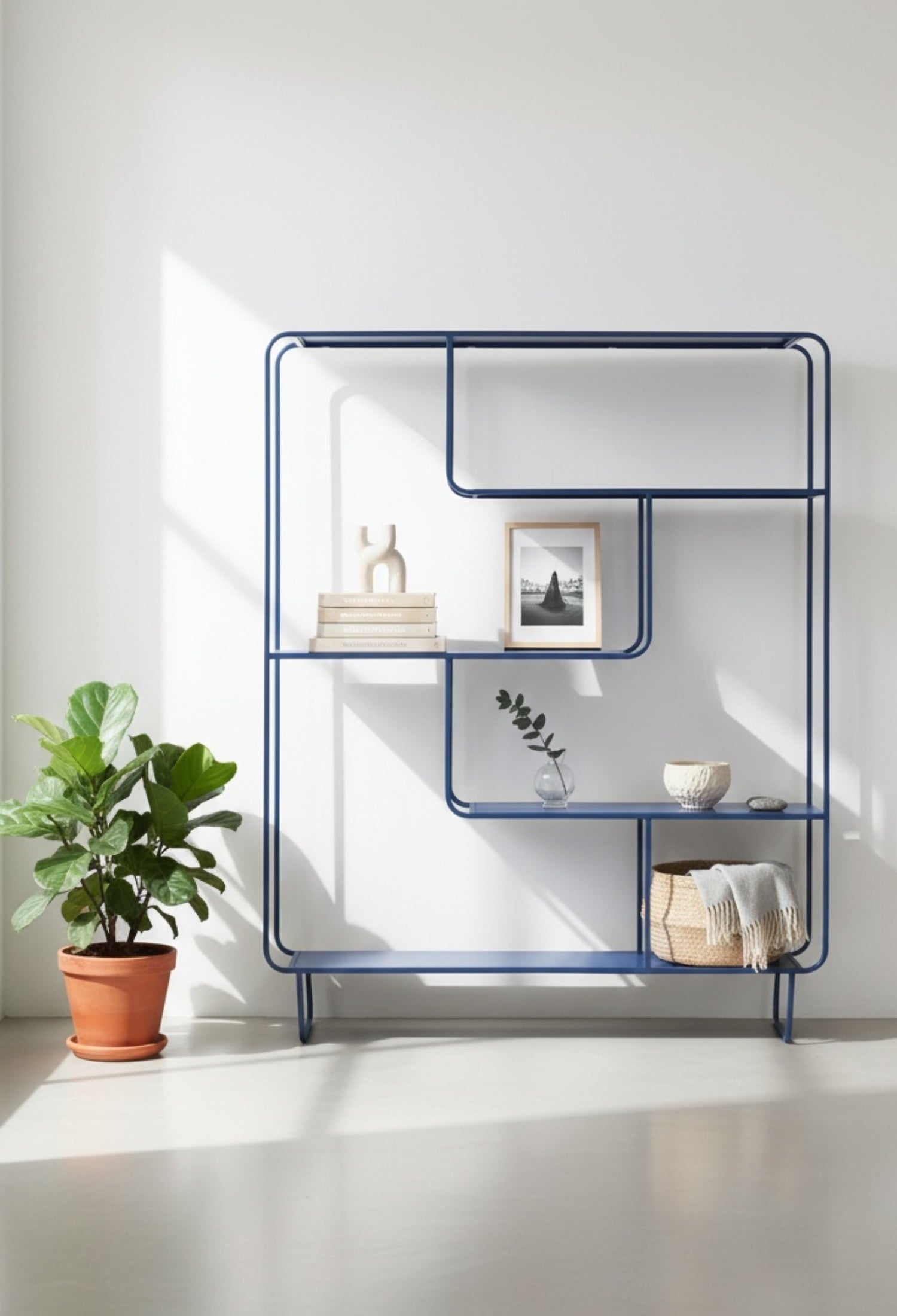 Estante Segovia con diseño geométrico y líneas continuas que aportan ligereza visual y un estilo moderno. Su estructura abierta de acero permite exhibir libros, objetos decorativos y piezas escultóricas de forma equilibrada, convirtiéndolo en un elemento funcional y decorativo ideal para salas, estudios o comedores contemporáneos.