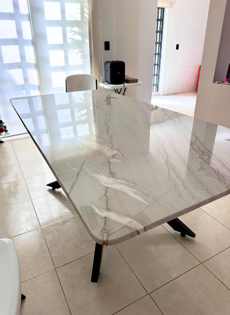 Características principales:Cubierta de mármol Blanco Carrara venato de Máxima Calidad: La mesa comedor cuenta con una superficie de granito auténtico de la más alta calidad. El mármol es conocido por su resistencia, durabilidad y belleza natural. Cada mesa puede presentar variaciones únicas en la textura y los patrones del mármol, lo que la convierte en una pieza