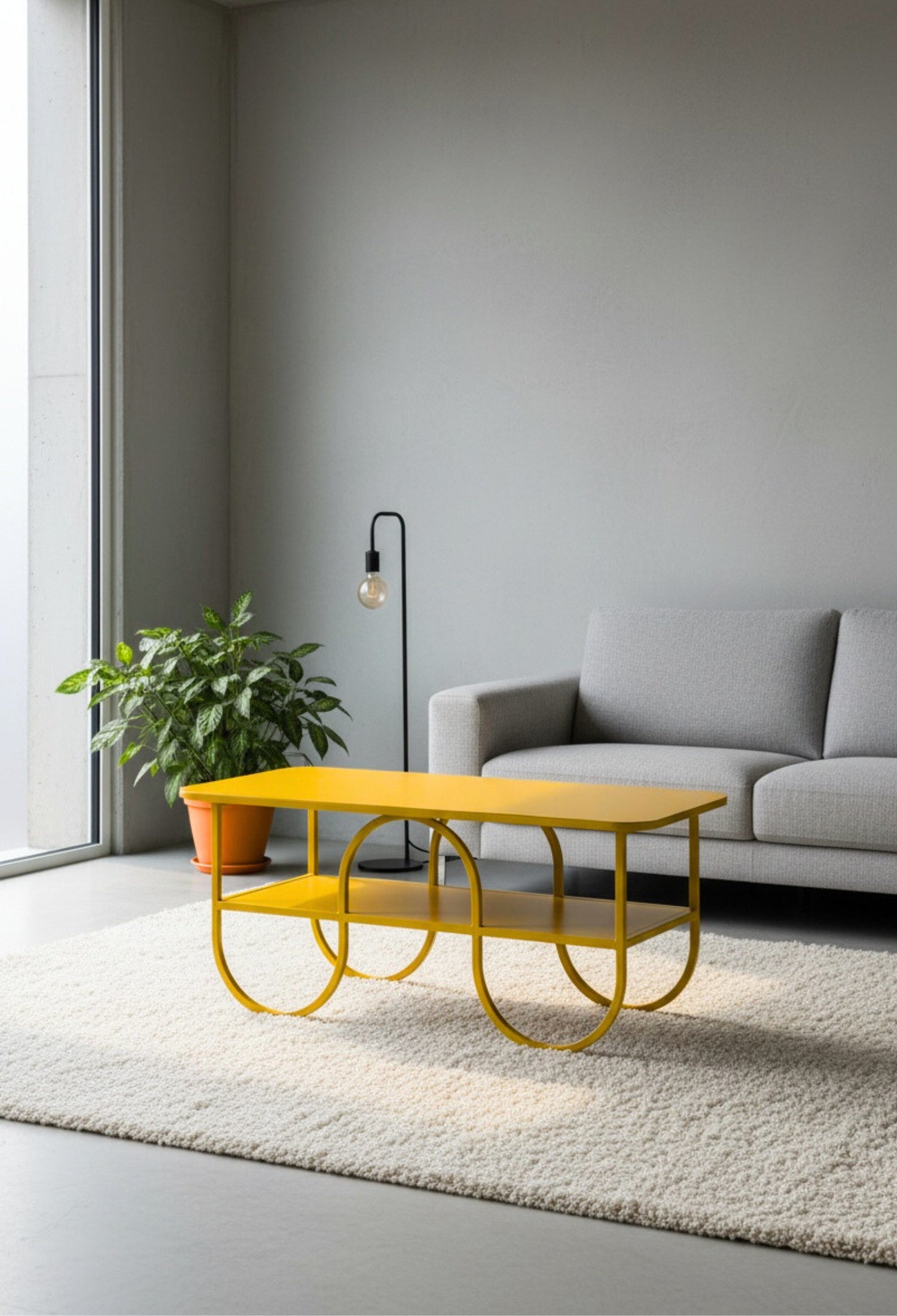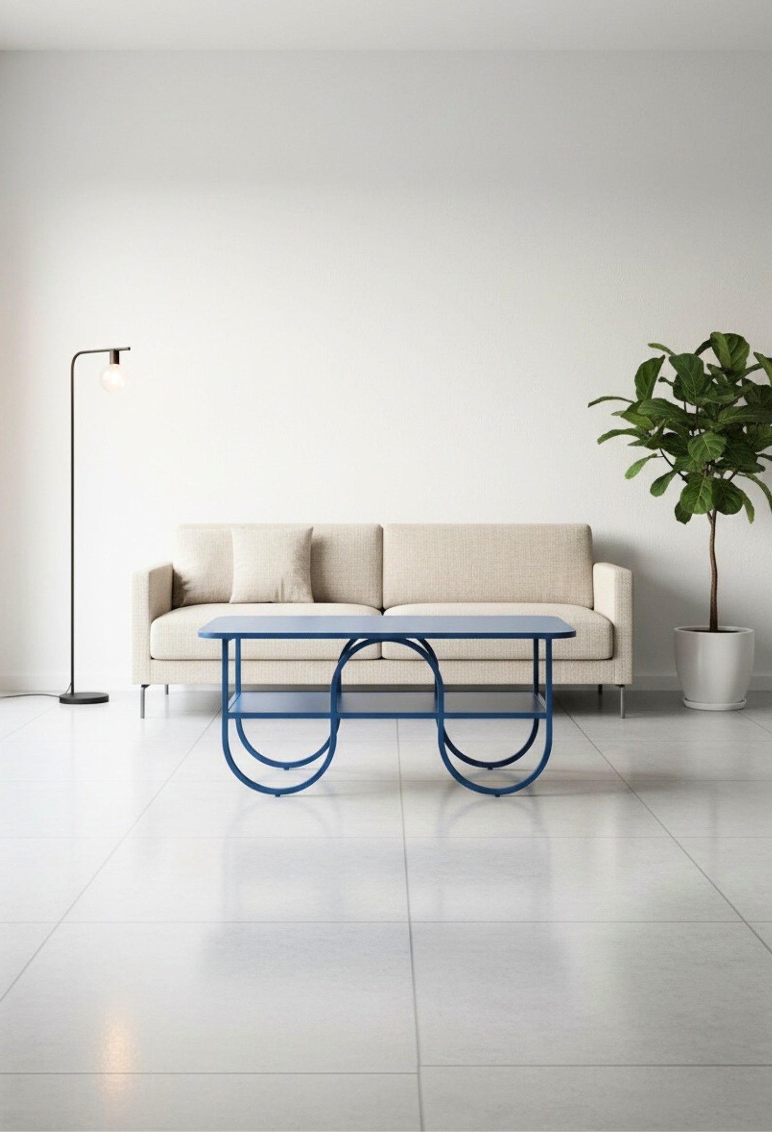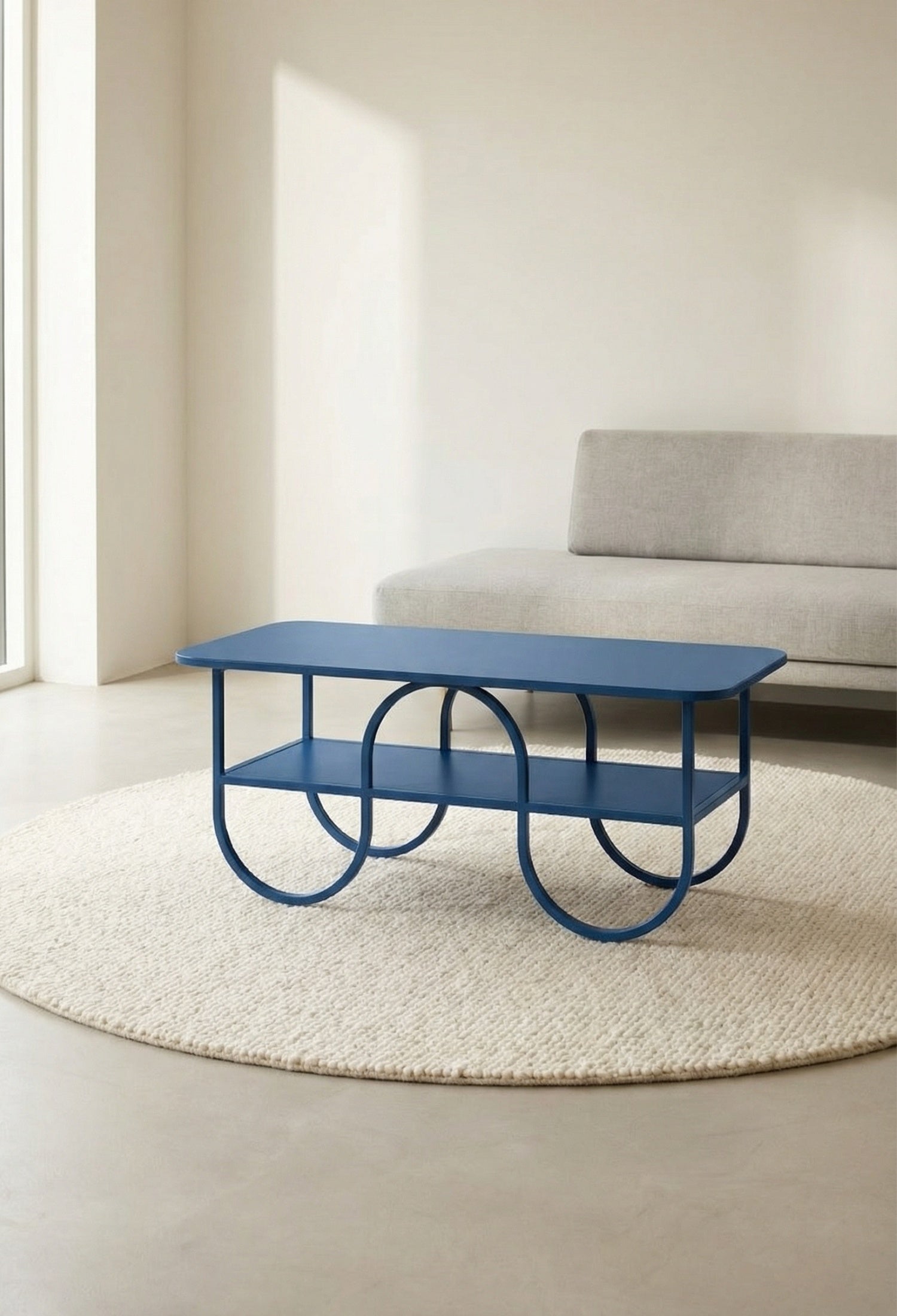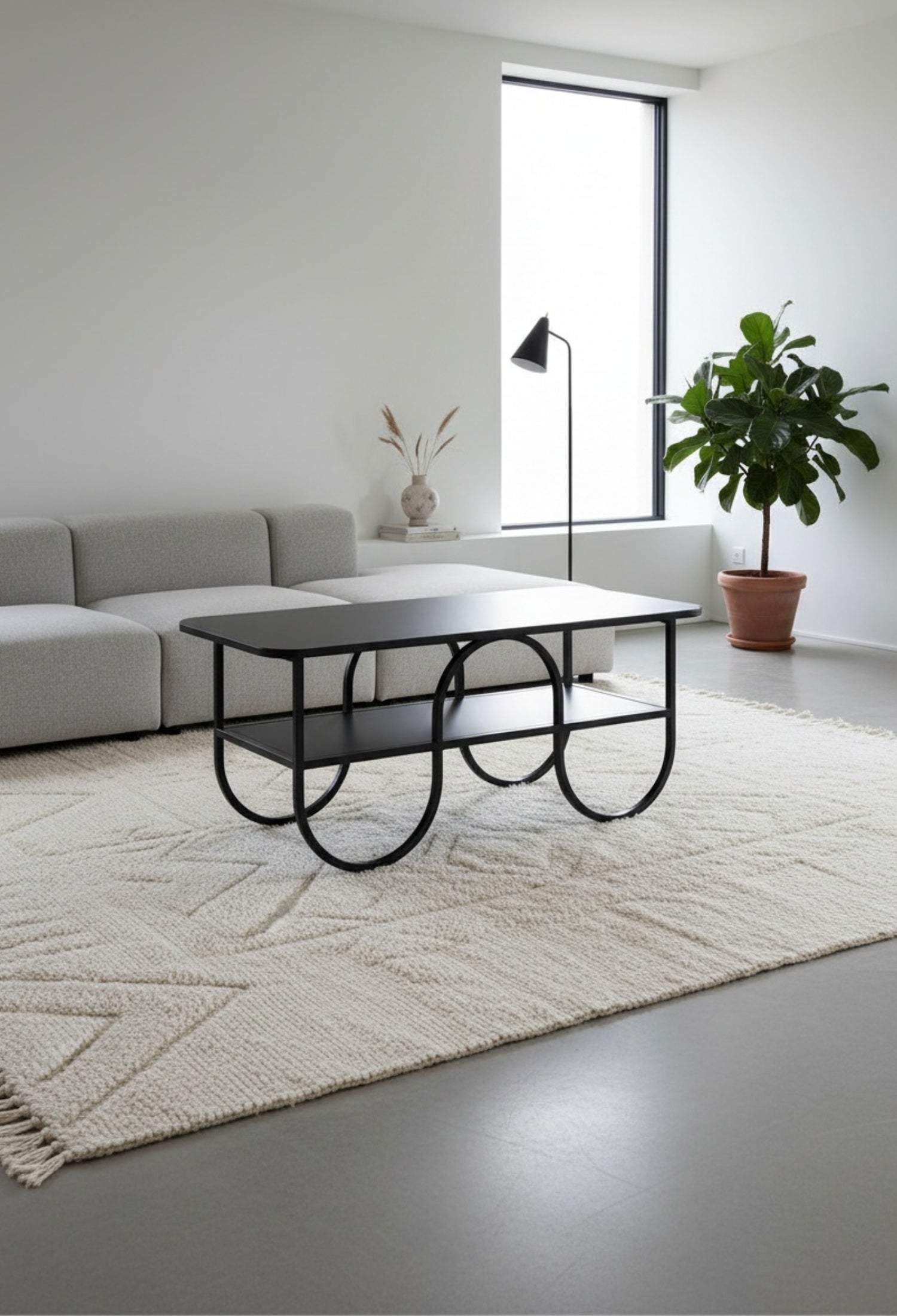 Mesa de centro con diseño asimétrico de dos niveles que combina funcionalidad y estilo moderno. Su estructura de acero resistente y acabado mate la convierten en una pieza versátil perfecta para salas contemporáneas, donde podrás organizar libros, decoración y objetos personales en diferentes alturas.