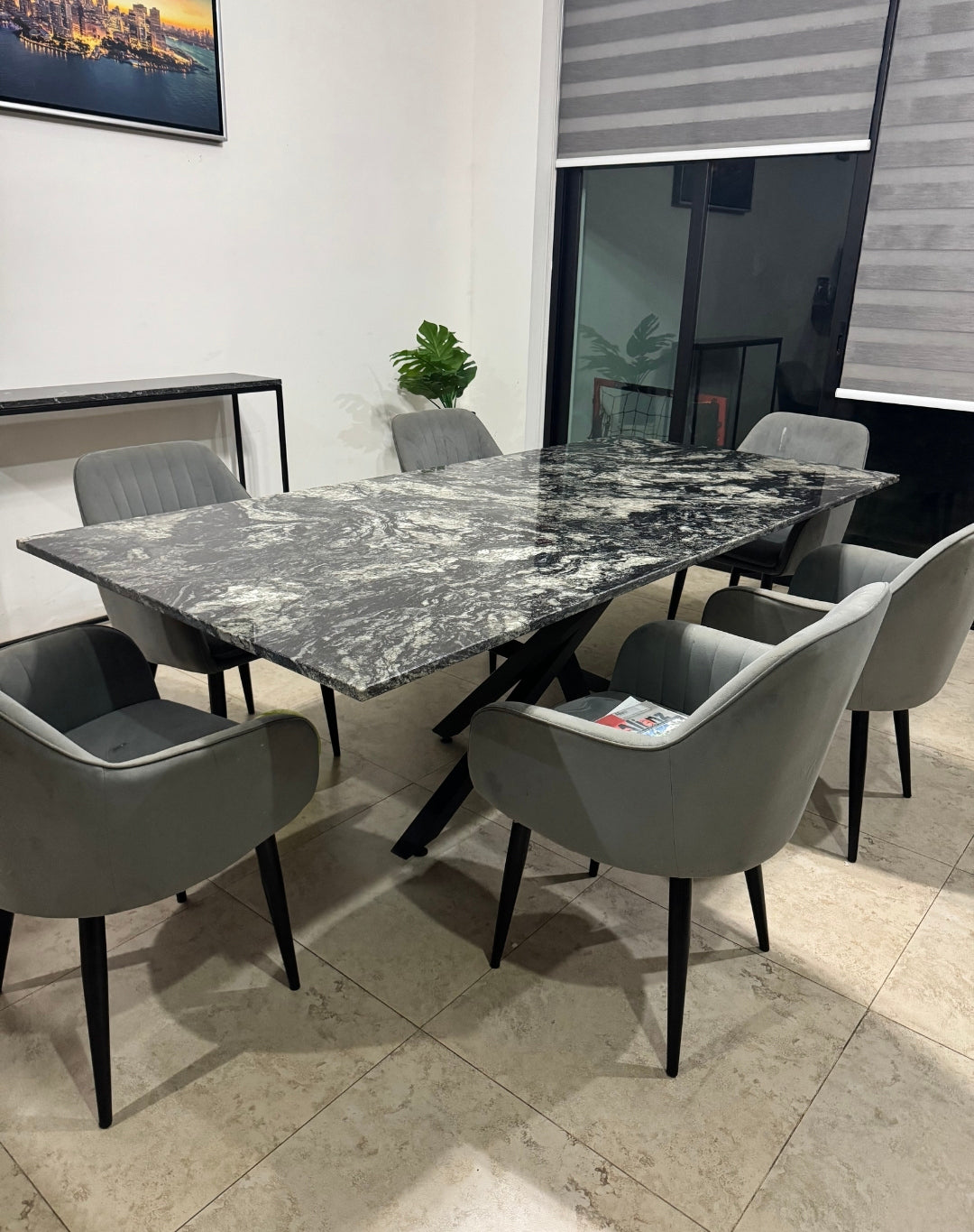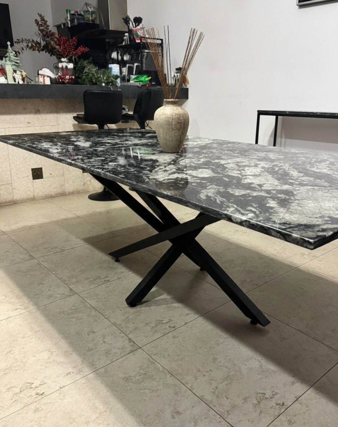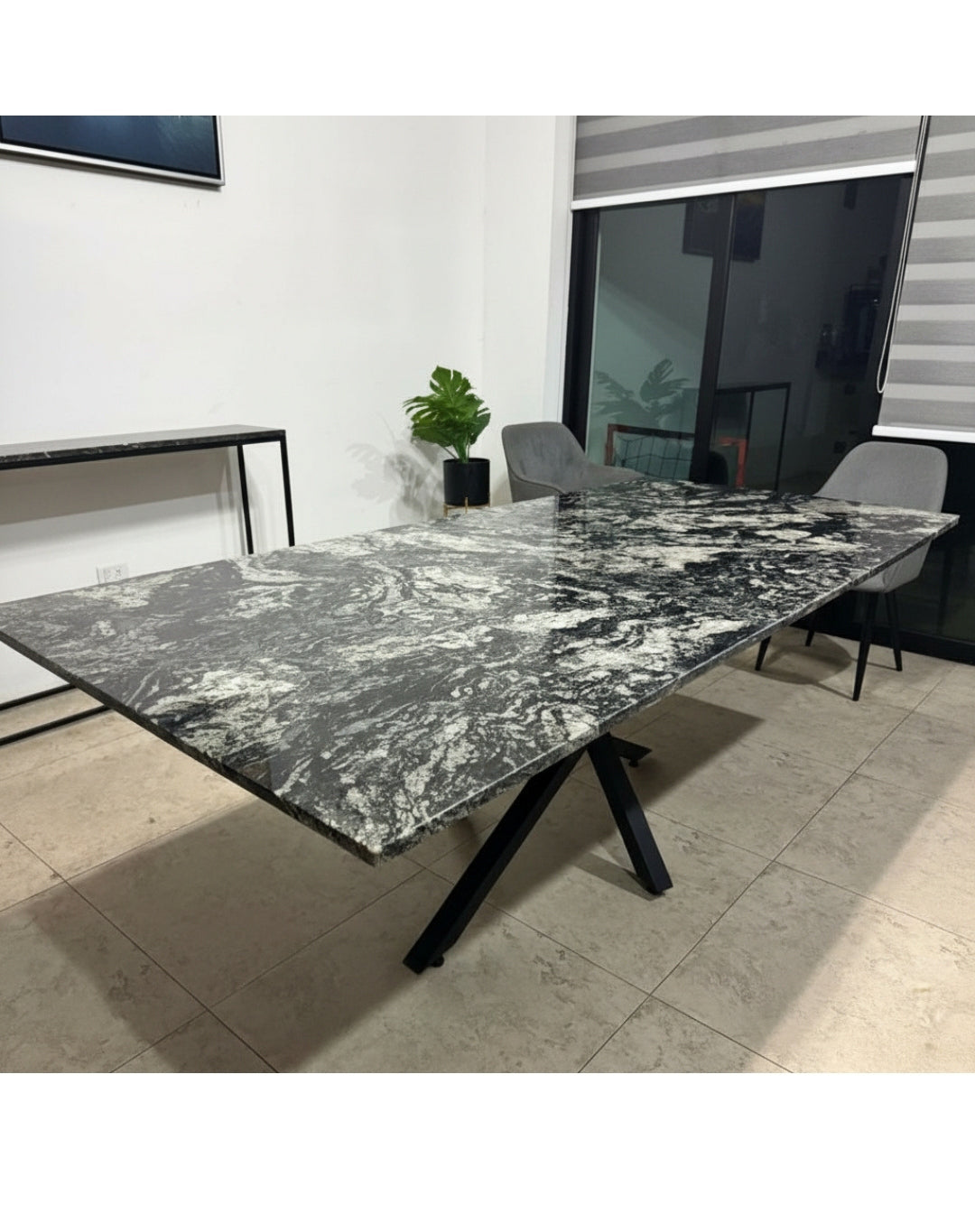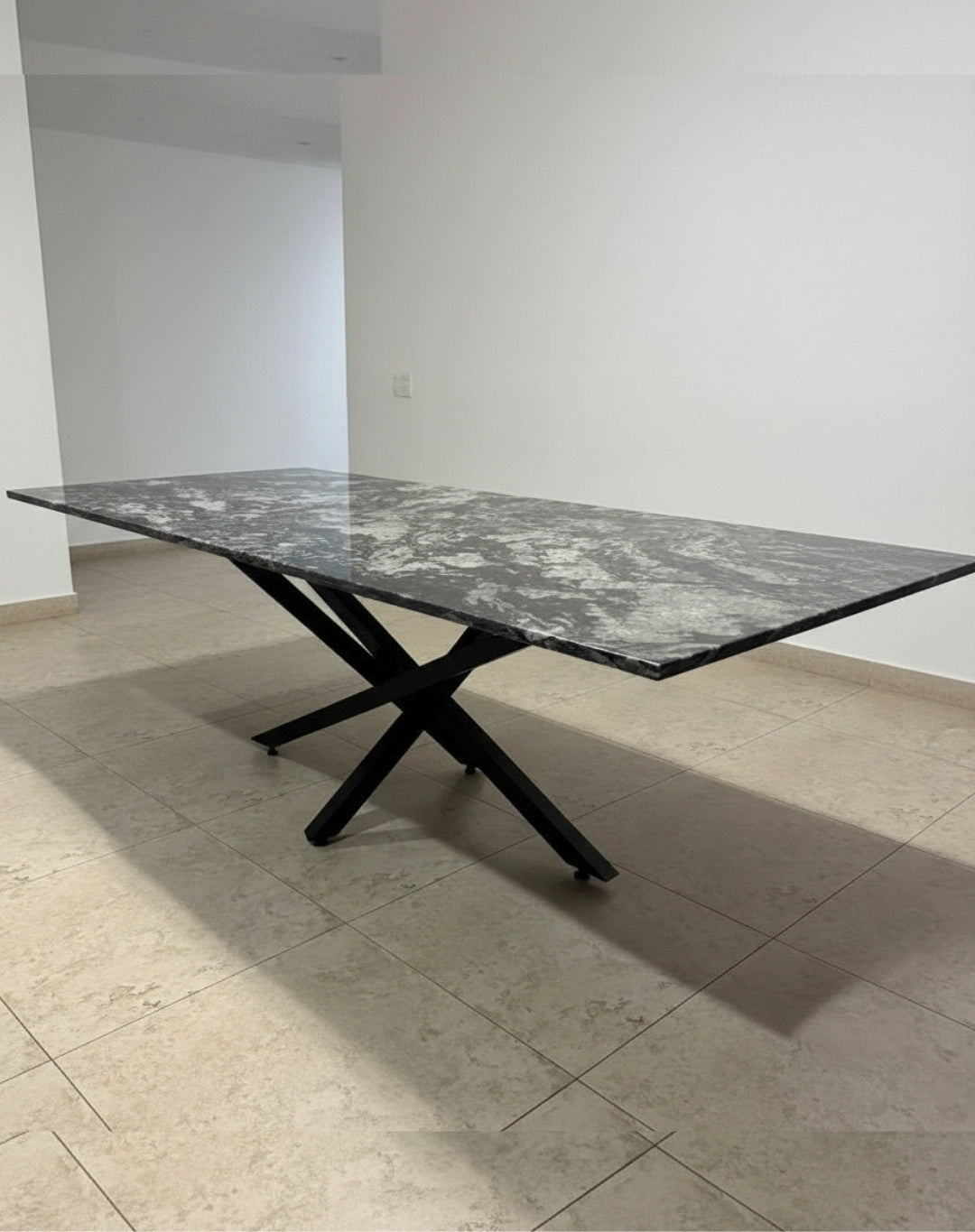 - Descripción: mesa para comedor, una pieza de mobiliario de alta gama, diseñada para tu mesa comedor ideal. Su característica más destacada es su cubierta de granito blue fantasy brillado, que aporta una apariencia elegante y una durabilidad excepcional.