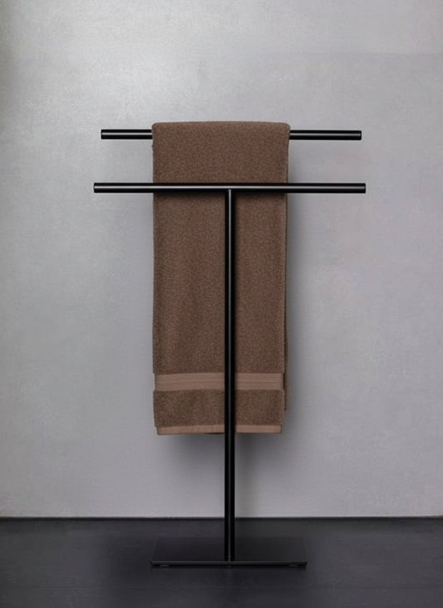 Los toalleros de pie, como su nombre indica, se colocan solos en el suelo y no requieren ninguna fijación o montaje en la pared.